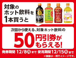 対象のソフトドリンクと揚げ物を同時購入で100円引 開催期間2025.11.11 - 2025.12.01 対象のお菓子を2個同時購入で30円引、3個同時購入で60円引 開催期間2025.11.11 - 2025.11.24 ホット飲料値引券がもらえるキャンペーン 開催期間2025.11.11 - 2025.12.08 サラダチキン各種と対象の飲料を同時購入で30円引 開催期間2025.11.11 - 2025.11.24