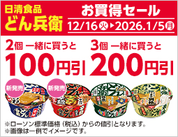 対象のカップ麺を2個同時購入で100円引、3個同時購入で200円引