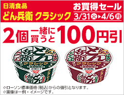 対象のカップ麺を2個同時購入で100円引 開催期間2026.03.31 - 2026.04.06 対象のドリンク剤を2本同時購入で100円引 開催期間2026.03.31 - 2026.04.27 対象のゼリー飲料を2個同時購入で50円引、3個同時購入で100円引 開催期間2026.03.31 - 2026.04.27